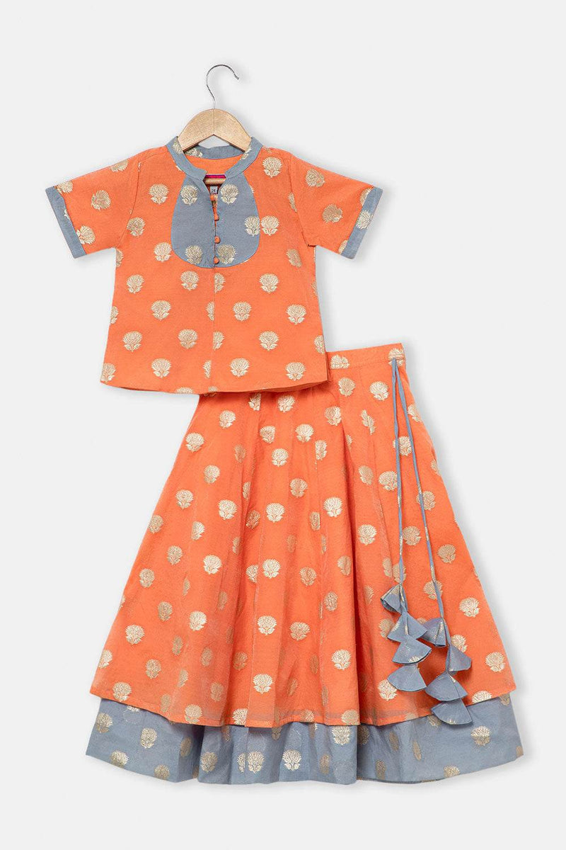 Chittythalli Girls Traditional Pavadai Set with Mandarin Collar Top and Double Layered Flared Skirt - Orange - PS70