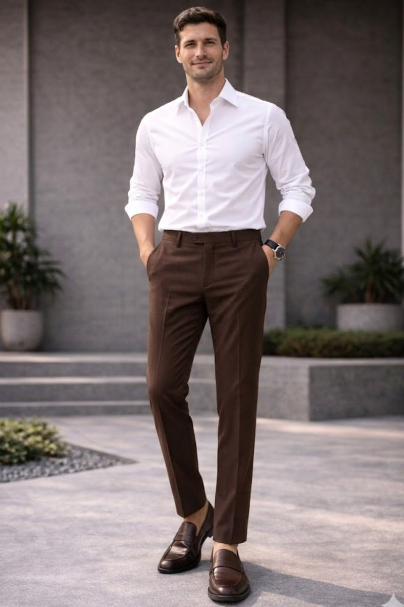 ENHANCE Men’s Cotton Stretch Formal Trousers – Regular Fit Office Wear Pants with Contrast Waistband & Coin Pocket | Classic Business Formal Pants for Men - Brown - TM06
