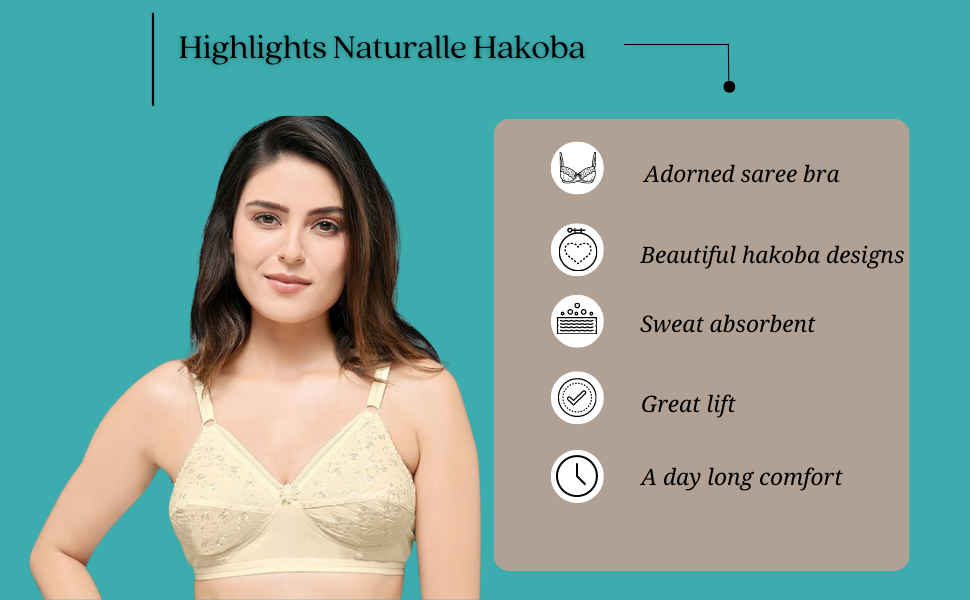 Naturalle Hakoba-Adorned Saree bra from renowned Naidu hall is crafted with specially designed cups to impart the triumph fit and an outstanding outlook when paired with sarees and bloused attires. The Touch of hakoba fabric designs and picot elastics fabric perks up the styling.