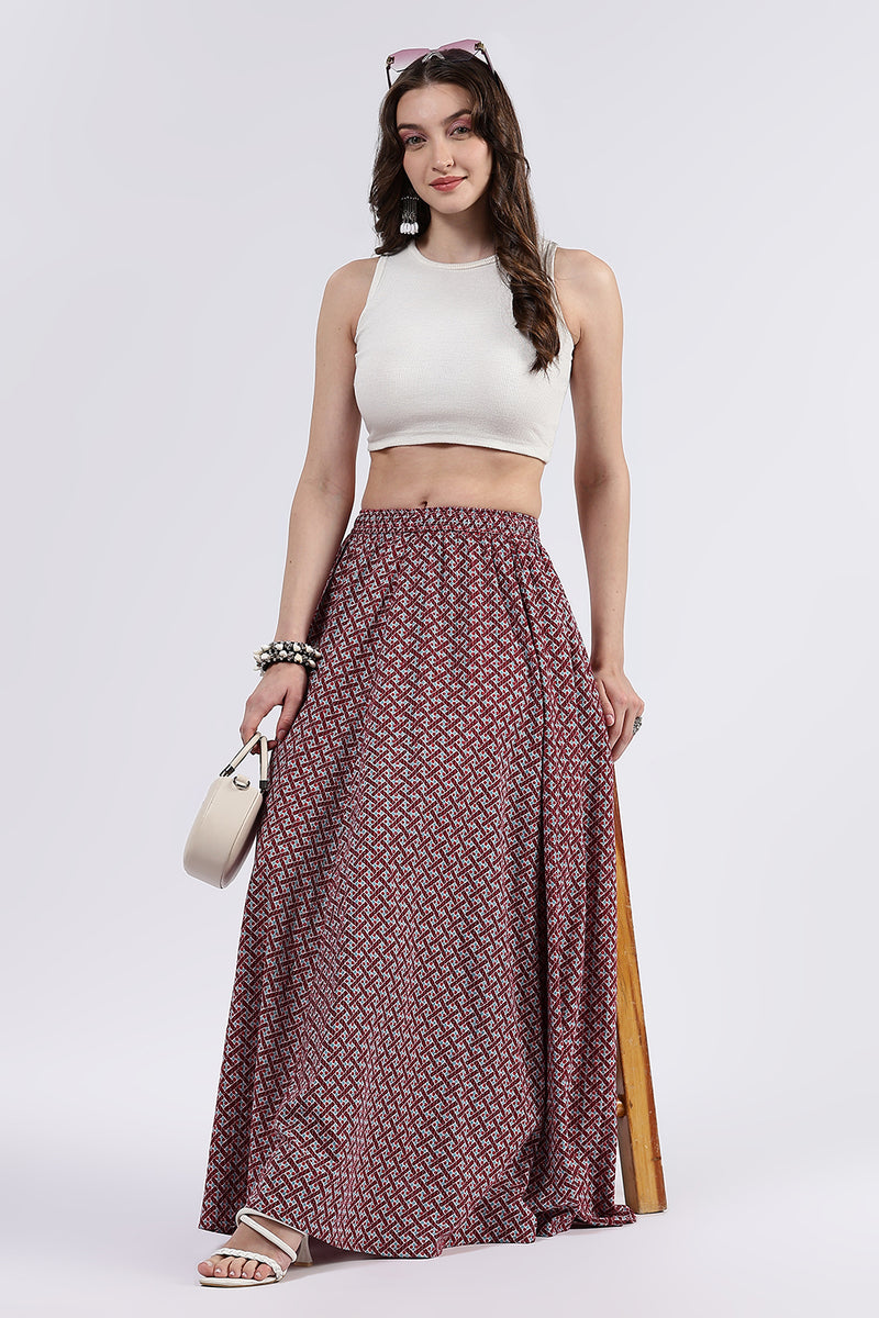 Mythri Women’s Cotton Blend Butta Stripe Kali Skirt with Elastic Waistband Full Length - Maroon - SK05