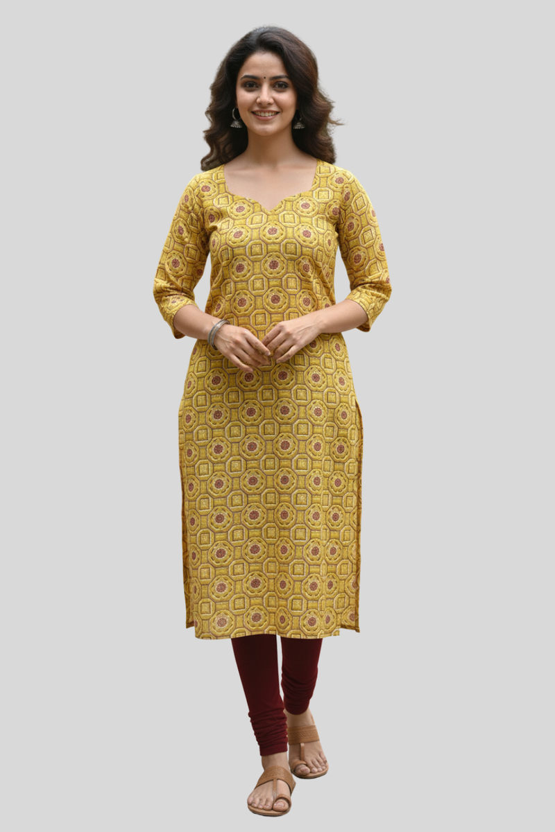 Mythri Women’s Cotton Straight Kurthi with V Slit Round Neck and 3/4th Sleeves - Yellow - R203