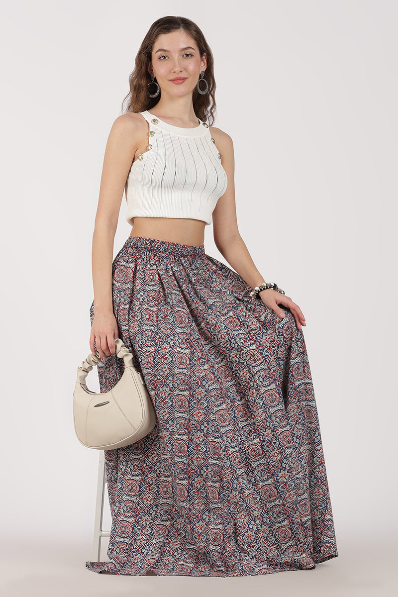 Add timeless elegance to your everyday and ethnic wardrobe with this women’s full-length kali skirt, thoughtfully designed for comfort, movement, and effortless style. Crafted from soft and breathable woven cotton blend fabric, this skirt features a classic kali silhouette with light gathers that create a graceful, flowing flare. The elasticated waistband ensures a secure yet comfortable fit, making it ideal for long hours of wear. Finished with a neatly folded hem, this skirt delivers a clean and polished look. The Jaipur-inspired print adds a traditional touch, making it suitable for casual outings, office wear, festive styling, or ethnic fusion looks. Easy to pair with kurtas, tops, or blouses, this skirt is a versatile essential for women who value both comfort and elegance.