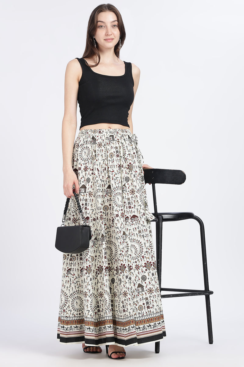 Elevate your everyday and ethnic wardrobe with this women’s long skirt, crafted from soft and breathable cotton blend woven fabric for all-day comfort. Designed with a flowy long-length silhouette, this skirt offers effortless elegance and ease of movement. The skirt features decorative tassel detailing, adding a subtle handcrafted charm to the design. The Jaipur-inspired print brings a traditional touch, making it perfect for casual outings, festive styling, office wear, or ethnic fusion looks. Comfortable, versatile, and easy to style, this long skirt pairs beautifully with kurtas, crop tops, blouses, or casual tops.
