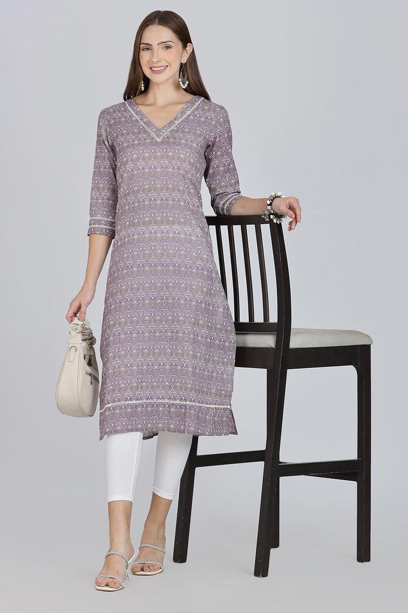 Mythri Women’s Cotton Straight Kurti | Geometric Floral Print V-Neck Kurta with Ladder Lace for Everyday Wear - Purple - K116
