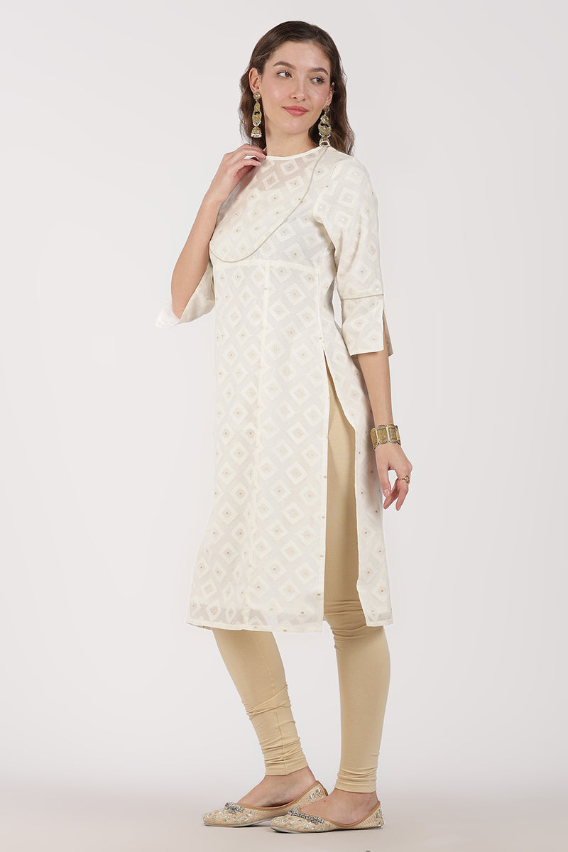 Mythri Women’s White Jacquard Chanderi Kurti – Gold Piping & Sheer Yoke Design - White Jacquard -1 - KU97