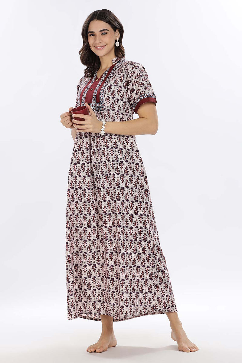 Naidu Hall Women’s Printed Cotton Blend Full Length Nighty with Mandarin Collar and V Slit - Maroon - NA67
