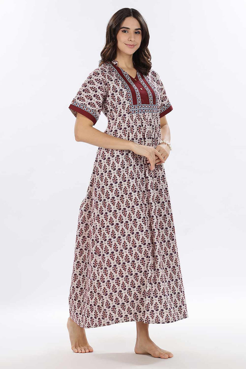 Naidu Hall Women’s Printed Cotton Blend Full Length Nighty with Mandarin Collar and V Slit Neckline - NA67