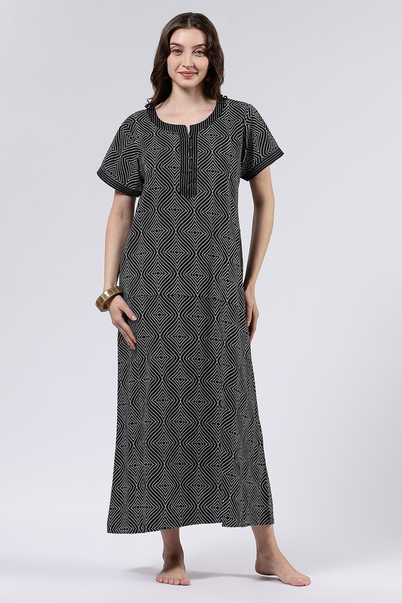 Naidu Hall Women’s Printed Cotton Full Length Nighty with Mandarin Collar and V Neckline - Black - NA68