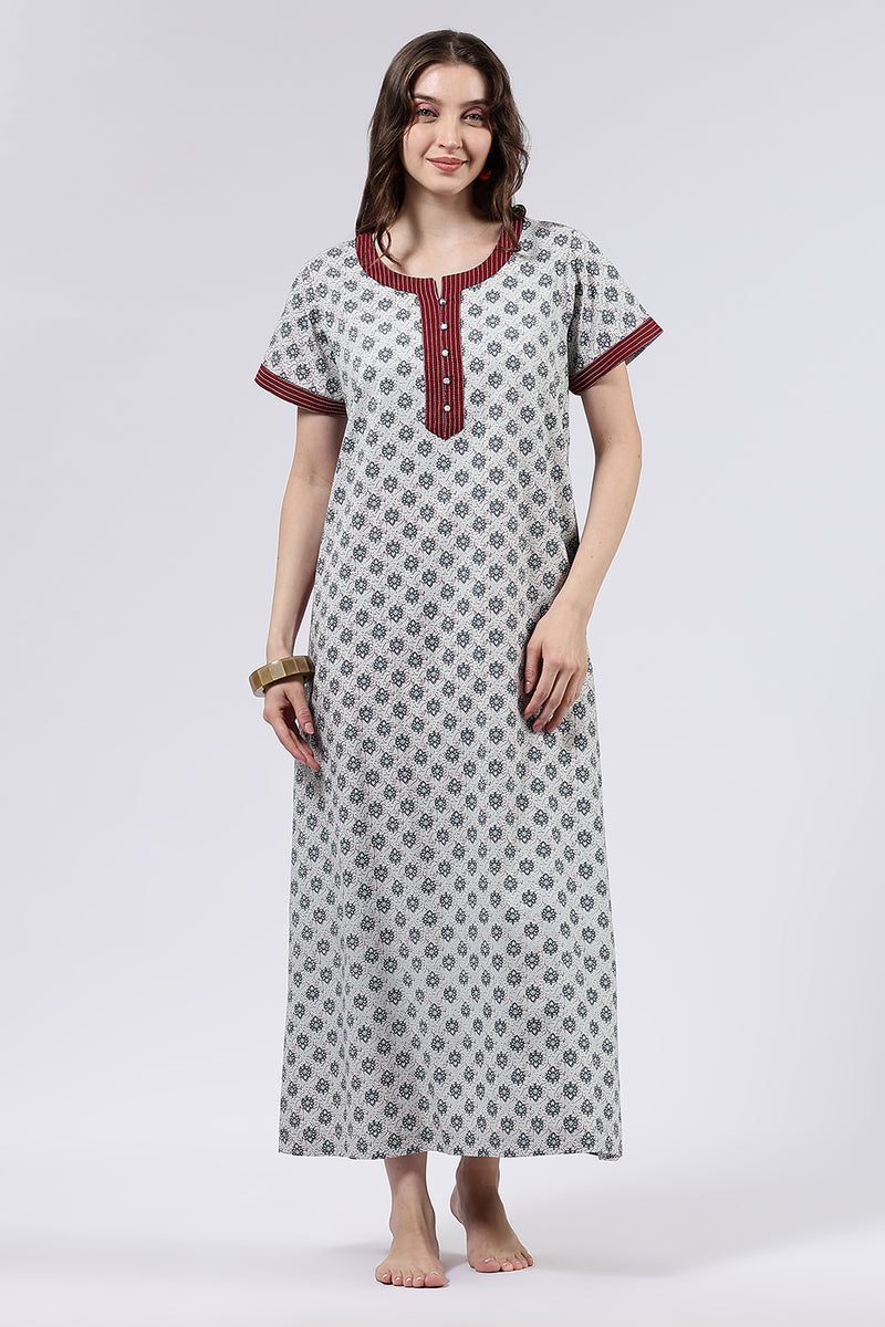 Naidu Hall Women’s Printed Cotton Full Length Nighty with Mandarin Collar and V Neckline - Light Grey - NA59