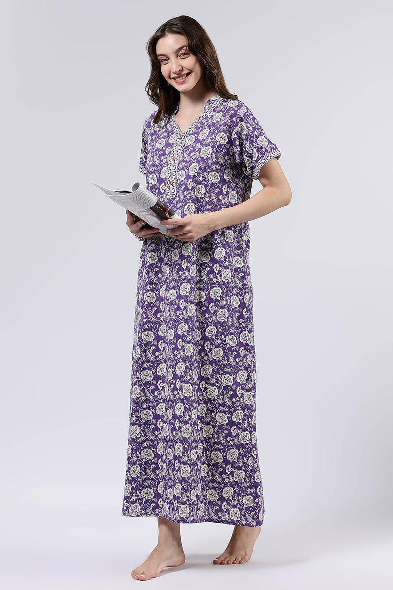 Naidu Hall Women’s Printed Cotton Full Length Nighty with Mandarin Collar and V Slit Neckline - Violet - NA69