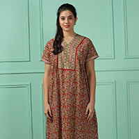 Naidu Hall Women’s Printed Cotton Nighty – Shirt Collar, Front Button Placket & Contrast Hem Detailing – Green- NA35