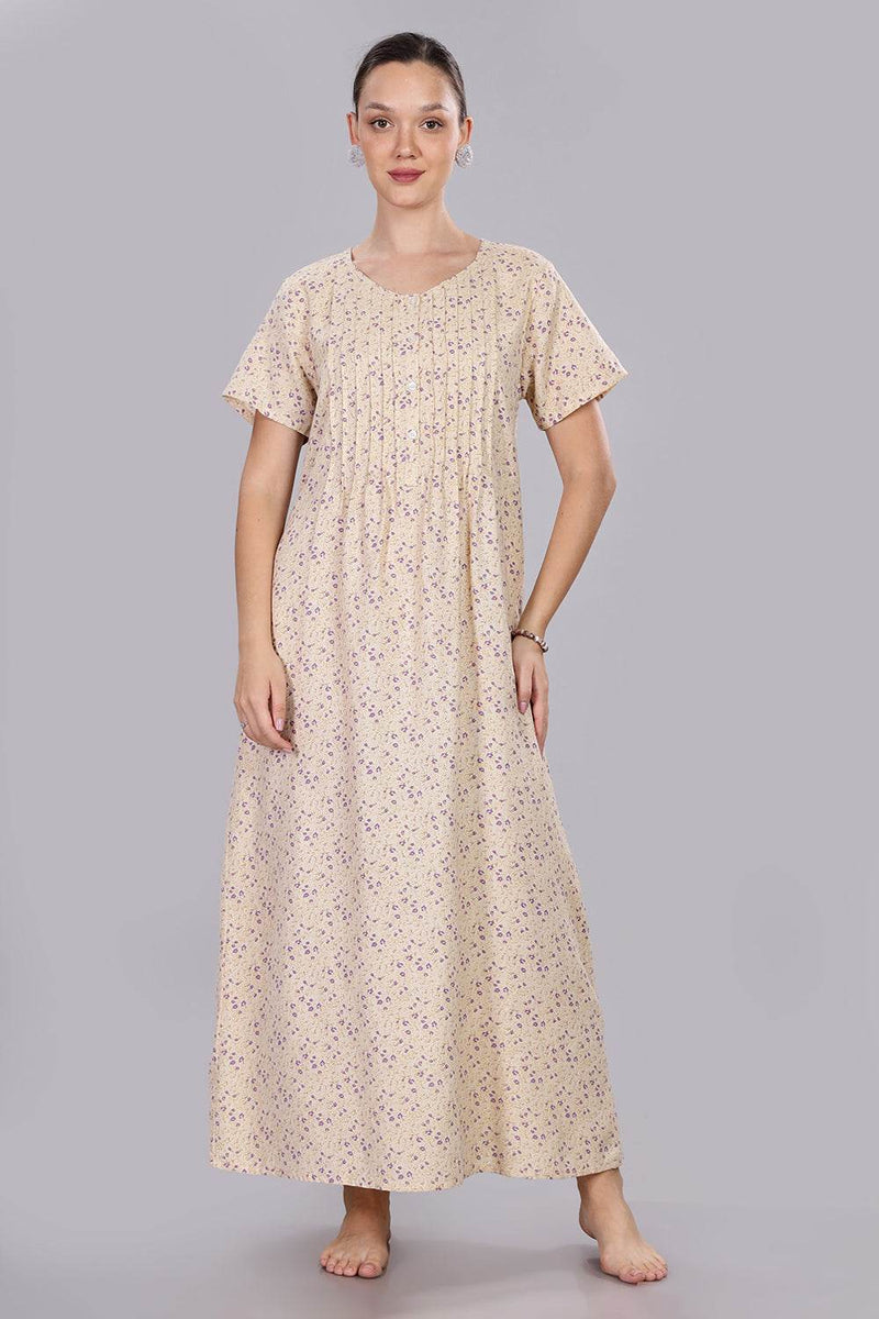 Naidu Hall Women's V-Neck A-Line Nighty with Front Button Placket and Pintuck Detailing - Beige - NT20