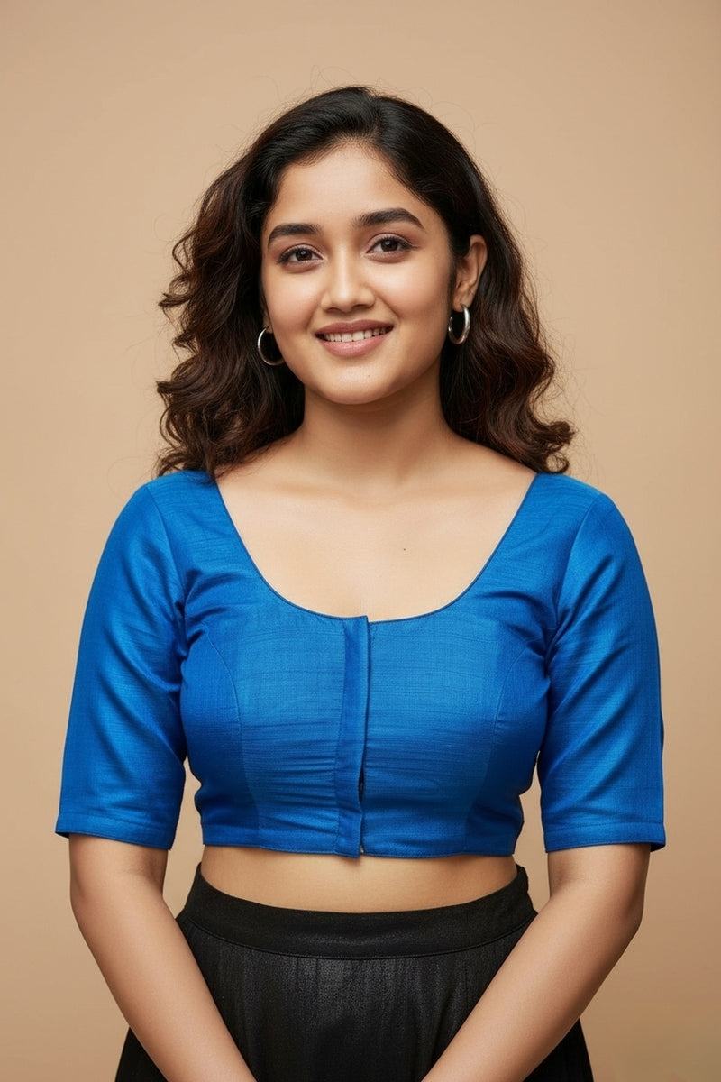 Women's Blouse Raw Silk Padded Front Open Round Neck Princess Cut Elbow Sleeve Saree Blouse with Round Back - Ananda Blue - R124