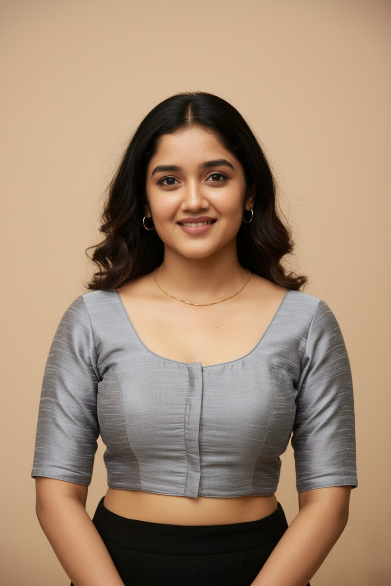 Women's Blouse Raw Silk Padded Front Open Round Neck Princess Cut Elbow Sleeve Saree Blouse with Round Back - Grey - R124