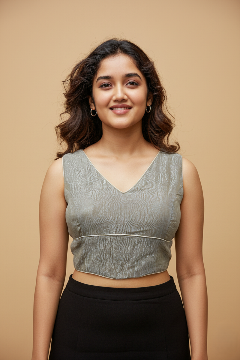 Turn heads with this women’s silk blend organza blouse, designed in a fashion-forward back open style for weddings, parties, and festive occasions. This padded blouse for women features a deep V-neckline with princess cut tailoring that creates a contoured and flattering fit. Crafted in luxurious organza silk blend fabric, this solid sleeveless blouse also comes with attachable sleeves for versatile styling. The deep V back design adds a bold yet elegant touch, making it a perfect party wear and wedding blouse for sarees.