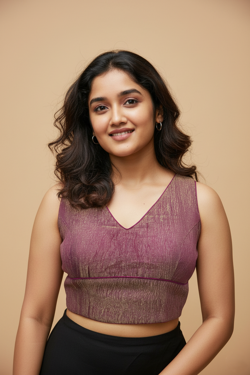 Turn heads with this women’s silk blend organza blouse, designed in a fashion-forward back open style for weddings, parties, and festive occasions. This padded blouse for women features a deep V-neckline with princess cut tailoring that creates a contoured and flattering fit. Crafted in luxurious organza silk blend fabric, this solid sleeveless blouse also comes with attachable sleeves for versatile styling. The deep V back design adds a bold yet elegant touch, making it a perfect party wear and wedding blouse for sarees.