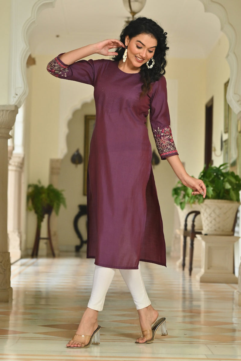 Women’s Cotton Blend Embroidered Kurthi with Round Neck and 3/4th Sleeves - Wine - 267