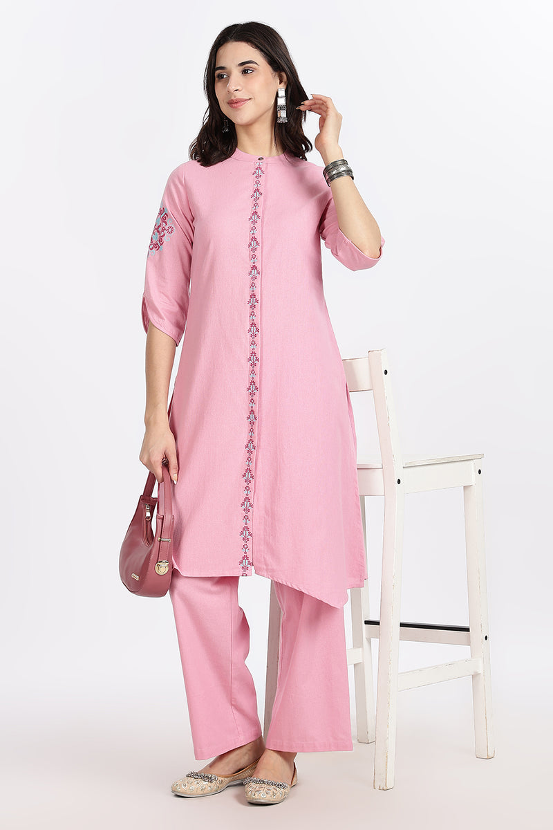 Mythri Women’s Cotton Embroidered Kurti with Asymmetric Hemline, Floral Thread Work & 3/4th Sleeves | Daily Wear Ethnic Kurta - KP25