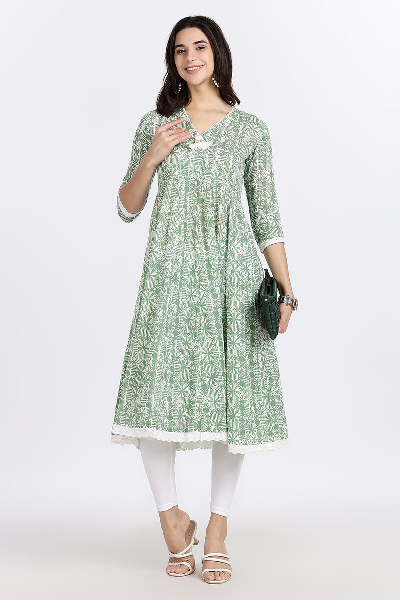 Mythri Women's Cotton Printed Anarkali Kurta with Geometric Floral Design, Lace Detailing & V-Neck Wrap Style | Daily Wear Cotton Dobby Kurti - A304