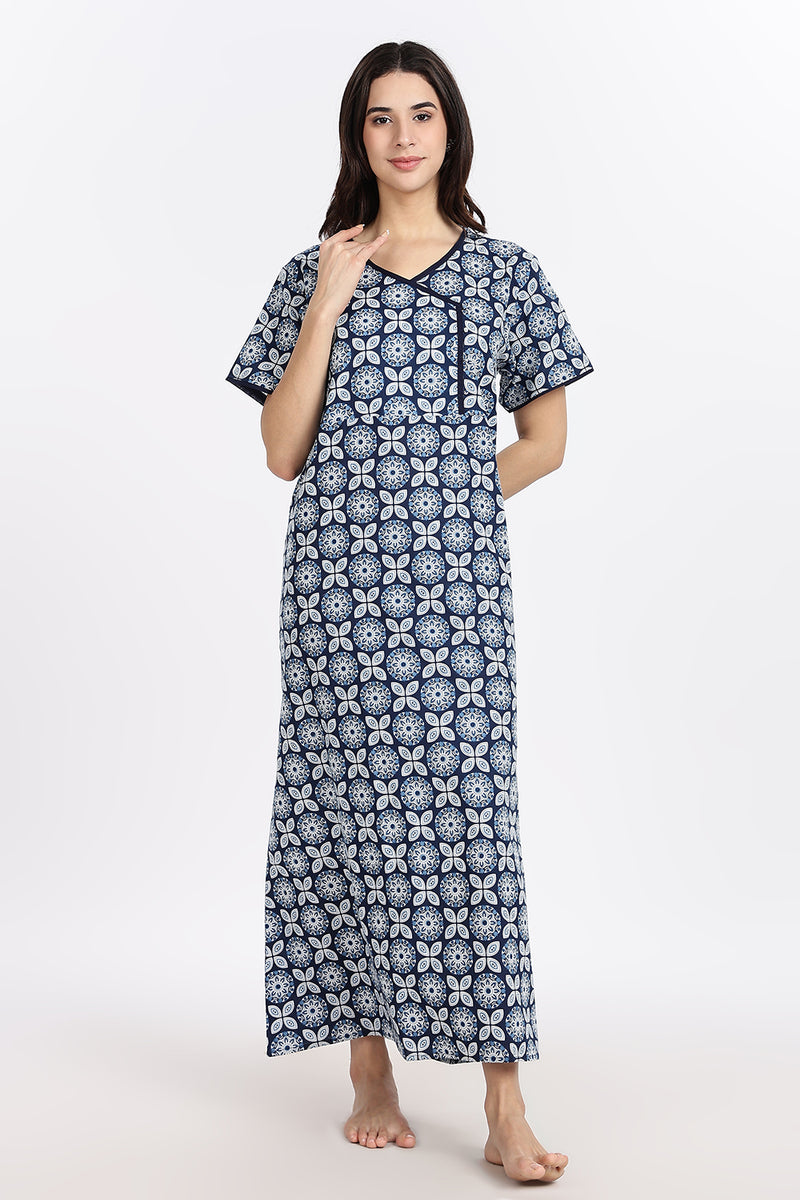 Experience effortless comfort and sophistication with this women’s A-line cotton-blend nighty, featuring a beautifully crafted overlapped front panel and a stylised V-neckline that adds a touch of elegance. The design is enhanced with non-functional buttons for decorative appeal and contrast piping at the neckline and sleeves for a refined finish. Made from a soft and breathable woven cotton-blend fabric, this nighty showcases a stunning indigo abstract all-over print, offering both style and comfort for nightly wear or relaxed home lounging. The short sleeves and A-line silhouette ensure ease of movement and all-night comfort.