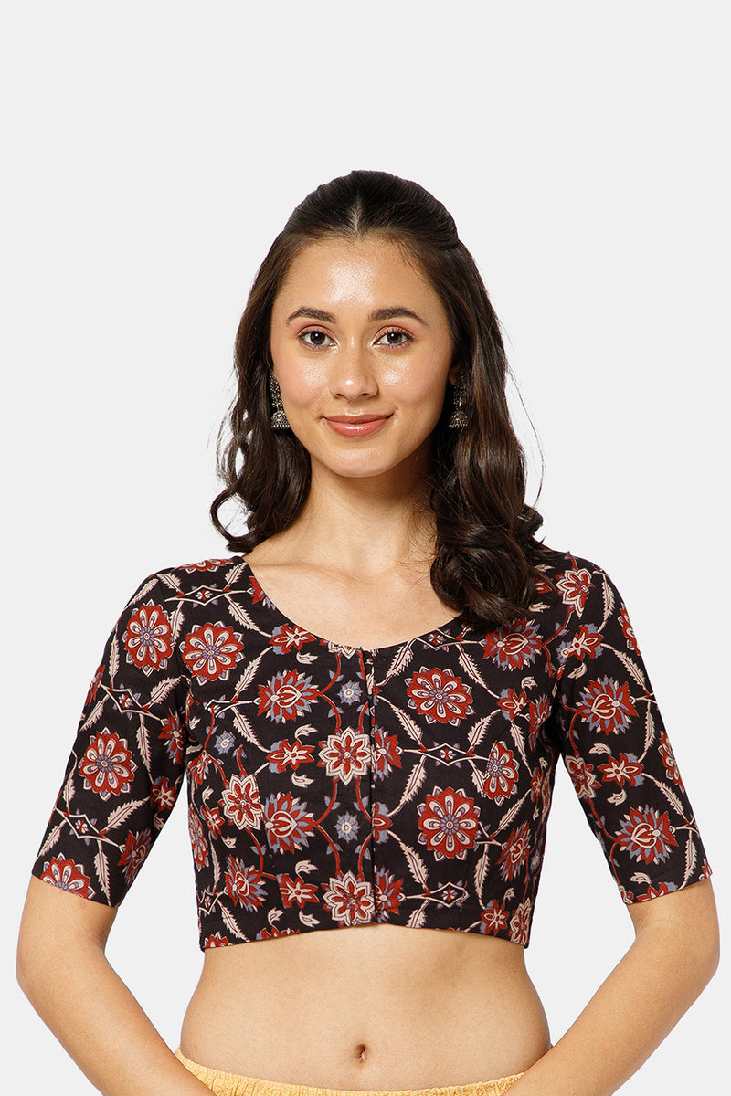 Naidu Hall Women’s Kalamkari Block Printed Cotton Blouse with U Neck Elbow Sleeves and Princess Cut - Black - BU17-P2