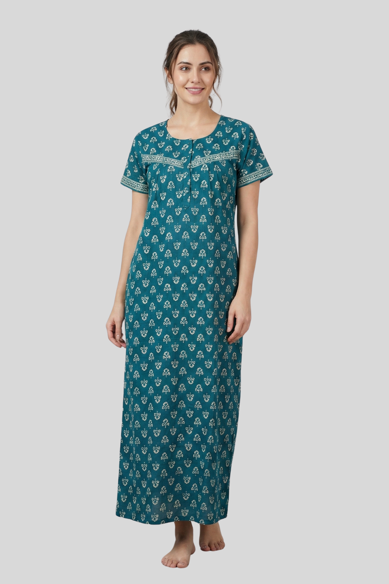 Discover comfort and style with this women’s nighty, crafted from a soft cotton blend fabric for everyday use. This full length nighty for women features a relaxed fit, short sleeves, and a round neckline with pleated detailing, making it ideal for both sleepwear and casual home wear. Perfect as a daily wear nighty, cotton night dress, or stylish printed women’s nighty, it offers breathable comfort with long-lasting durability. Designed to keep you cool and relaxed, this women’s cotton nighty is easy to wash and maintain, making it a must-have addition to your nightwear collection.