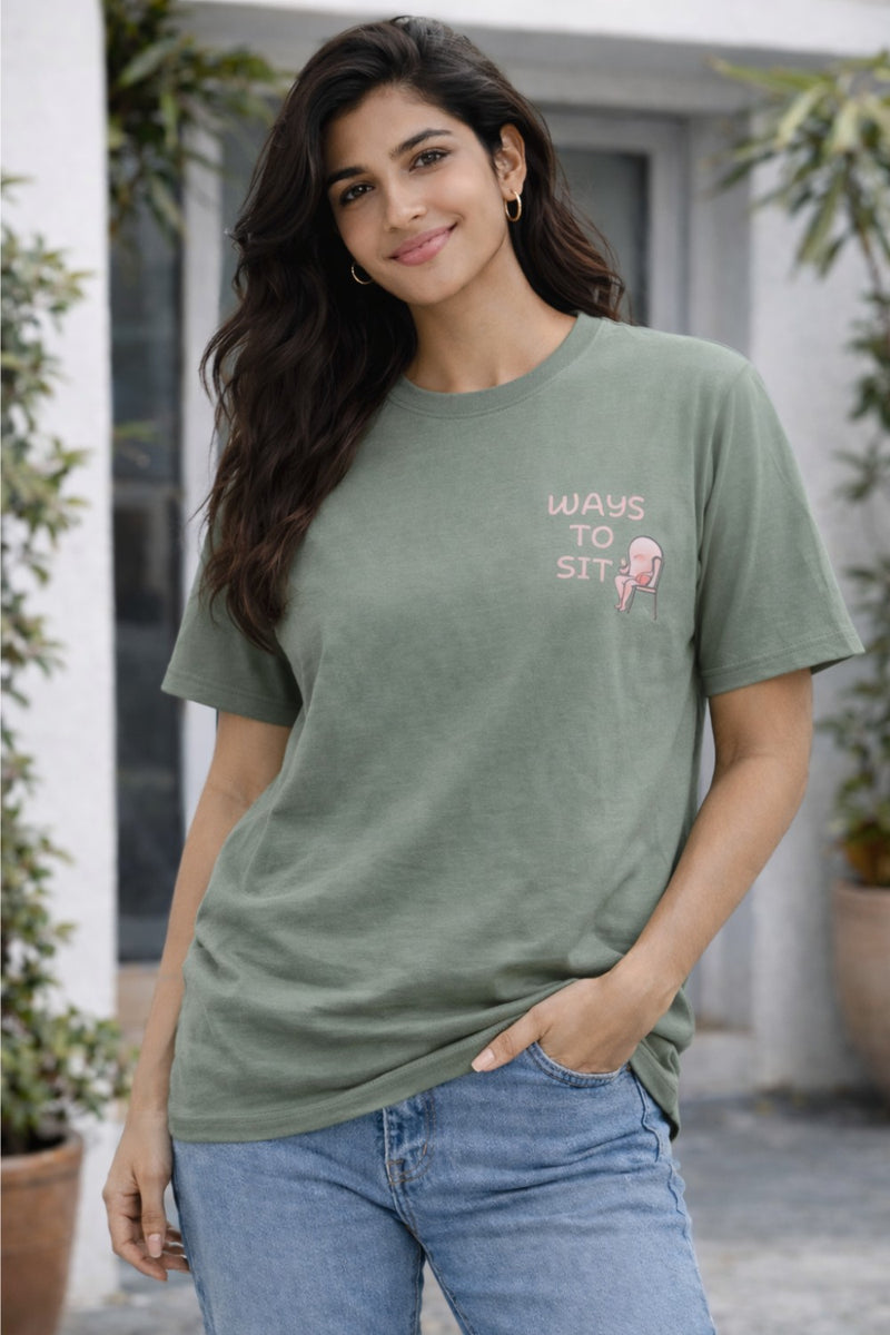 Graphic Cotton T-Shirt for Women & Unisex by Enhance Printed T-Shirt | “Ways to Sit” Round Neck Half Sleeve Crew Neck Tee | Front & Back Print COMFORTZONE Design | Everyday Casual Streetwear - Green - TG07